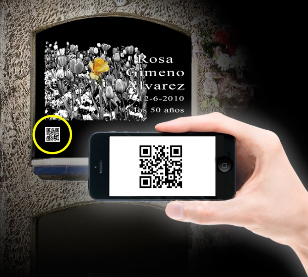 It is situated in an easy and discreet placement anywhere on a small plate, resistant to the weather, we could recorder the QR code in an resistant to weather material like aluminium which easily adheres to the headstone.